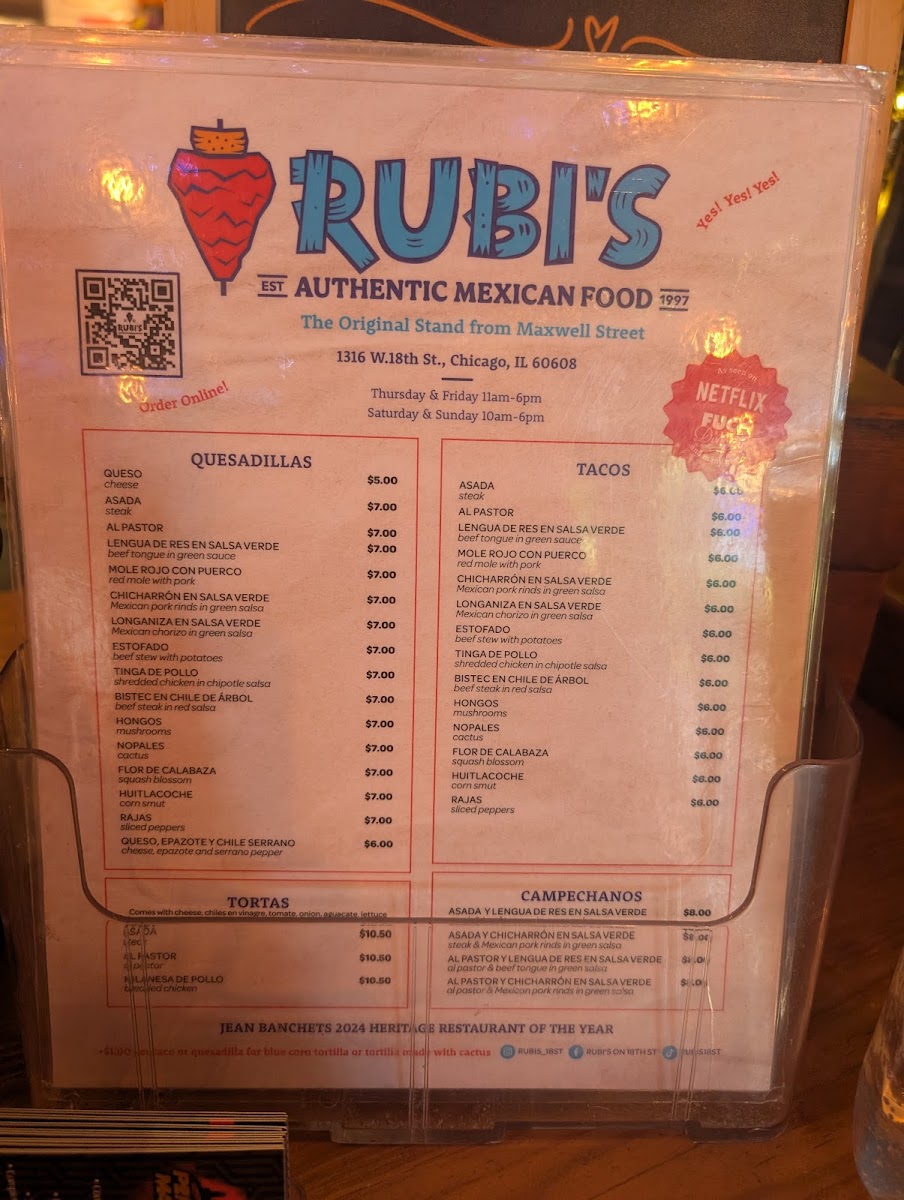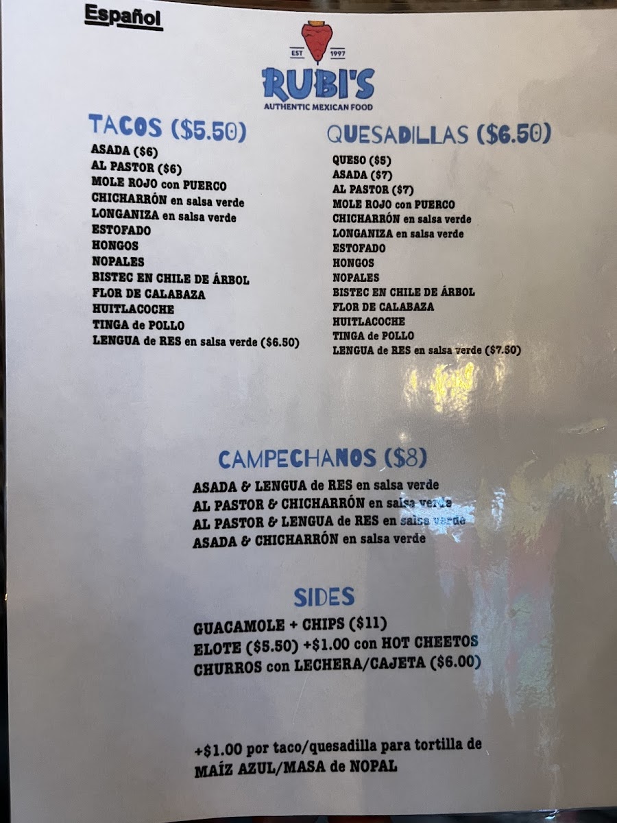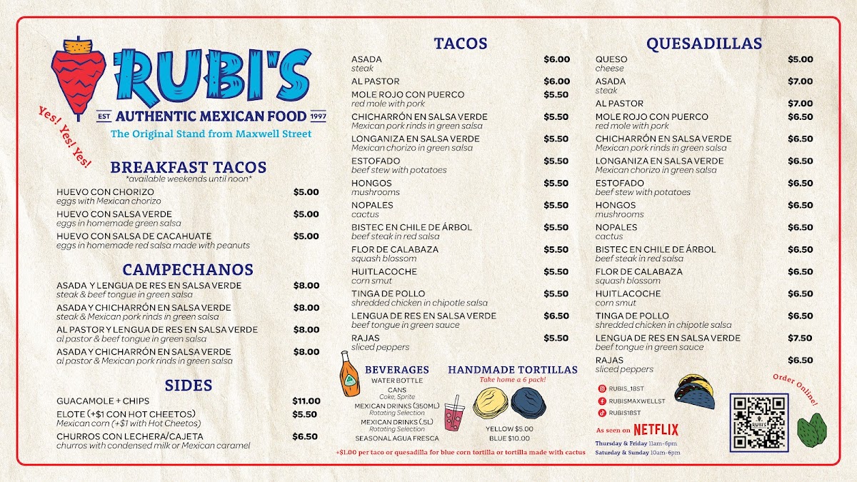 Rubi’s Tacos offers a straightforward menu that celebrates authentic flavors with a focus on simple, satisfying Mexican dishes. The selection is approachable and casual, perfect for anyone looking to enjoy a relaxed meal in a lively, welcoming setting. From hand-made tortillas that cradle classics like Tacos De Asada and Tacos Al Pastor to unique options such as Quesadilla De Huitlacoche, the menu reflects traditional tastes with a thoughtful twist.